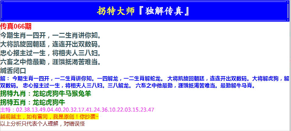 066期拐特大师澳门传真[图]