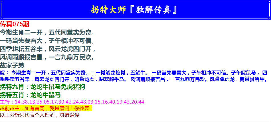 075期拐特大师澳门传真[图]